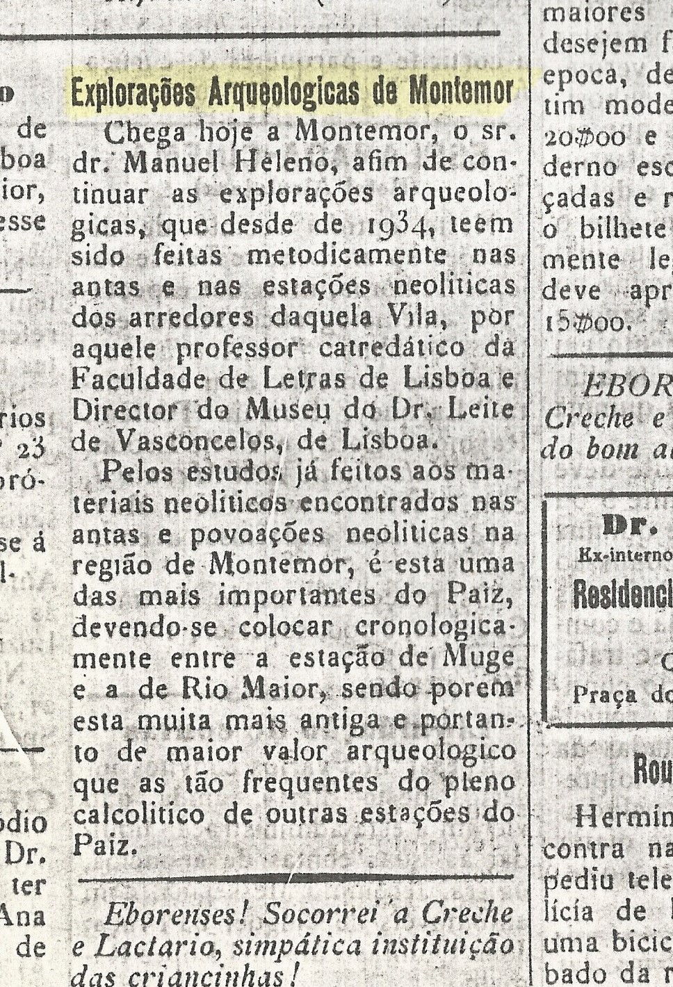 Duas pequenas notícias de 1937 (Outubro e Dezembro) referem a descoberta de um povoado Neolítico, próximo da cidade de Évora, não sendo porém citado qualquer topónimo que nos permita identificar o local em causa. Julgo ser de descartar a hipótese do "Alto de São Bento de Cástis", uma vez que esse sítio com vestígios pré-históricos, seria objecto de referencias deste mesmo autor já em 1938. A descrição de 37 aponta para um sítio com características diversas (ver a esse propósito uma entrada de Mário carvalho no Blog Carta Arqueológica de Évora) como se deduz dos recortes que divulgamos referentes ao Alto de São Bento (de Maio de 1938).
