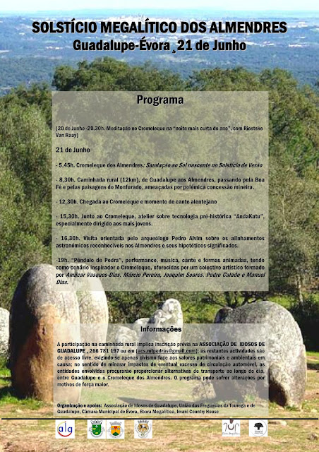 Recentemente, acolhendo uma minha proposta, a União de Freguesias da Tourega e de Guadalupe, promoveu a recolha em vídeo dos testemunhos pessoais de três habitantes já idosos da freguesia os quais, de alguma maneira, têm que ver com o CROMELEQUE DOS ALMENDRES. Desde logo o Ti Bento (Bento Calhau) residente no Monte das Pedras que, ainda jovem, participou nos primeiros levantamentos de pedras megalíticas no sítio das Pedras Talhas, mesmo antes da sua identificação pelo arqueólogo Henrique Leonor de Pina, trabalhos executados à ordem do Engenheiro Miguel Soares, antigo proprietário da Herdade. Nesses trabalhos participaram também o Ti Samina, que ainda conheci no Monte das Pedras mas falecido vai quase para duas décadas e António Canaverde, do aldeia vizinha da Boa Fé, onde faleceu há muitos anos. Foi também recolhido o testemunho de Manuel Estevão, "canteiro" reformado da Câmara Municipal de Évora, responsável pelo restauro de alguns dos menires dos Almendres, intervenção promovida pela Câmara Municipal de Évora no final dos anos 80 e coordenada por Màrio Varela Gomes. A qualidade técnica e eficácia do trabalho de Manuel Estevão não passou despercebida na altura e ele viria mais tarde a ser "requisitado" para outros importantes restauros megalíticos, desde logo no vizinho Cromeleque da Portela de Mogos, mas também na reerecção do gigantesco Menir de Meadas, em Castelo de Vide, trabalho coordenado por Jorge Oliveira, há duas décadas atrás.