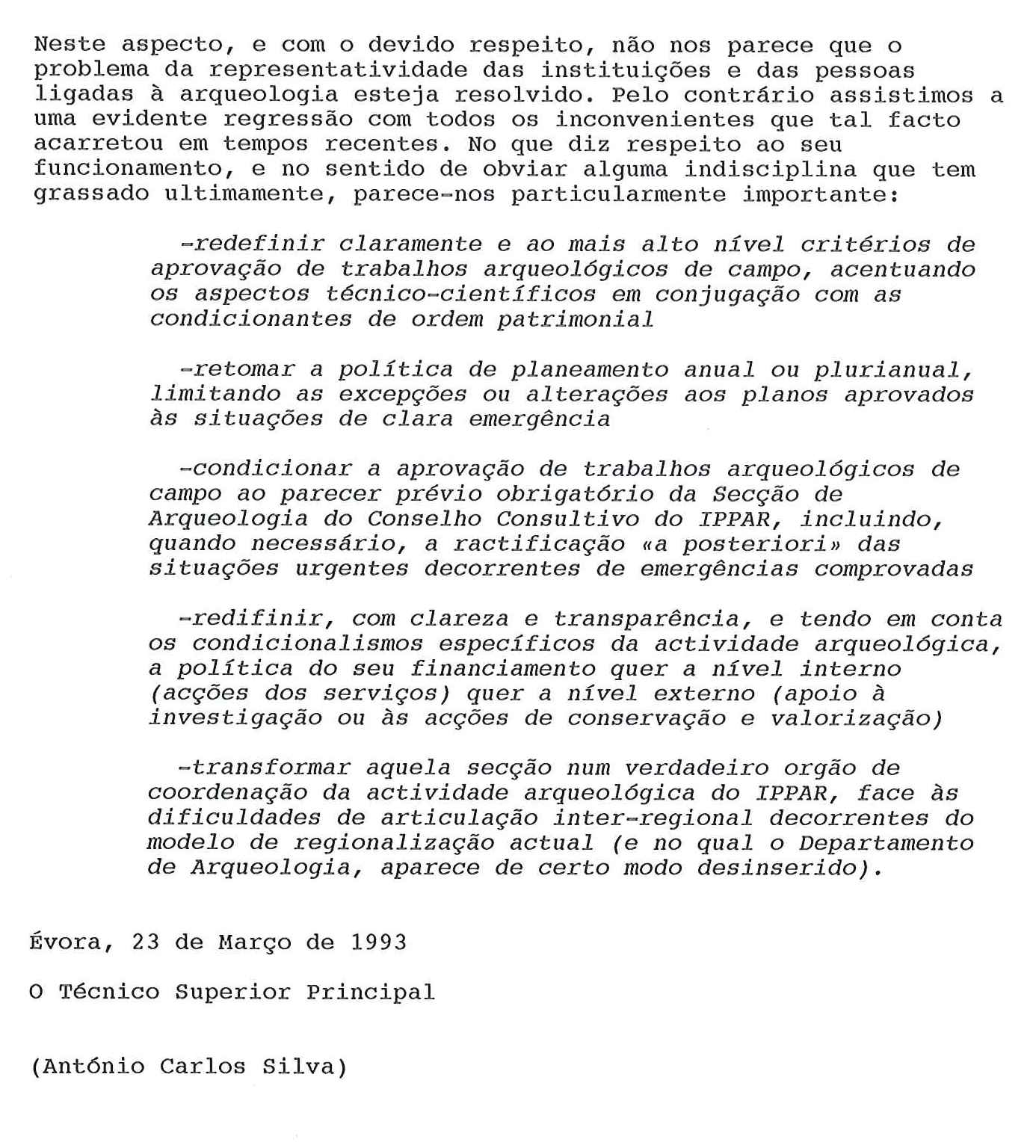 A propósito das palavras sempre avisadas de Francisco Sande Lemos e rebuscando no meu "arquivo" de velharias, encontrei um "parecer" de 1993 que aqui deixo a título de curiosidade historiográfica. Destaco o parágrafo em que me refiro a Comissão Nacional Provisória de Arqueologia (1981-1985) a cujas reuniões cheguei a presidir como Director do Departamento de Arqueologia e em substituição dos Drs João Bairrão Oleiro ou Justino Mendes de Almeida, na qualidade de vice-presidentes do IPPC com o "pelouro" da Arqueologia.